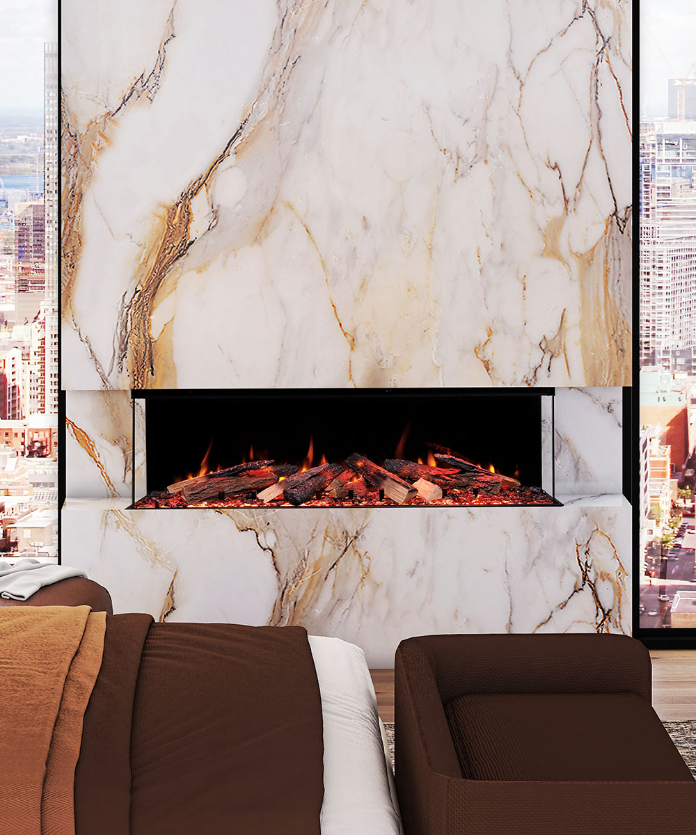 Available in bay, corner or single-sided configurations, BonFire fireplaces adapt seamlessly to your space, offering versatile design options that suit both open layouts and classic installations.