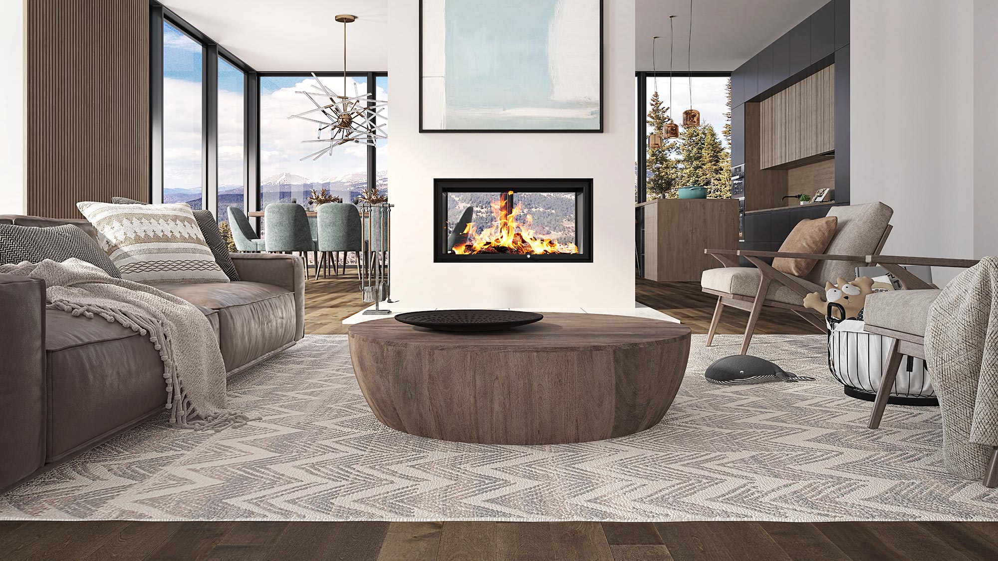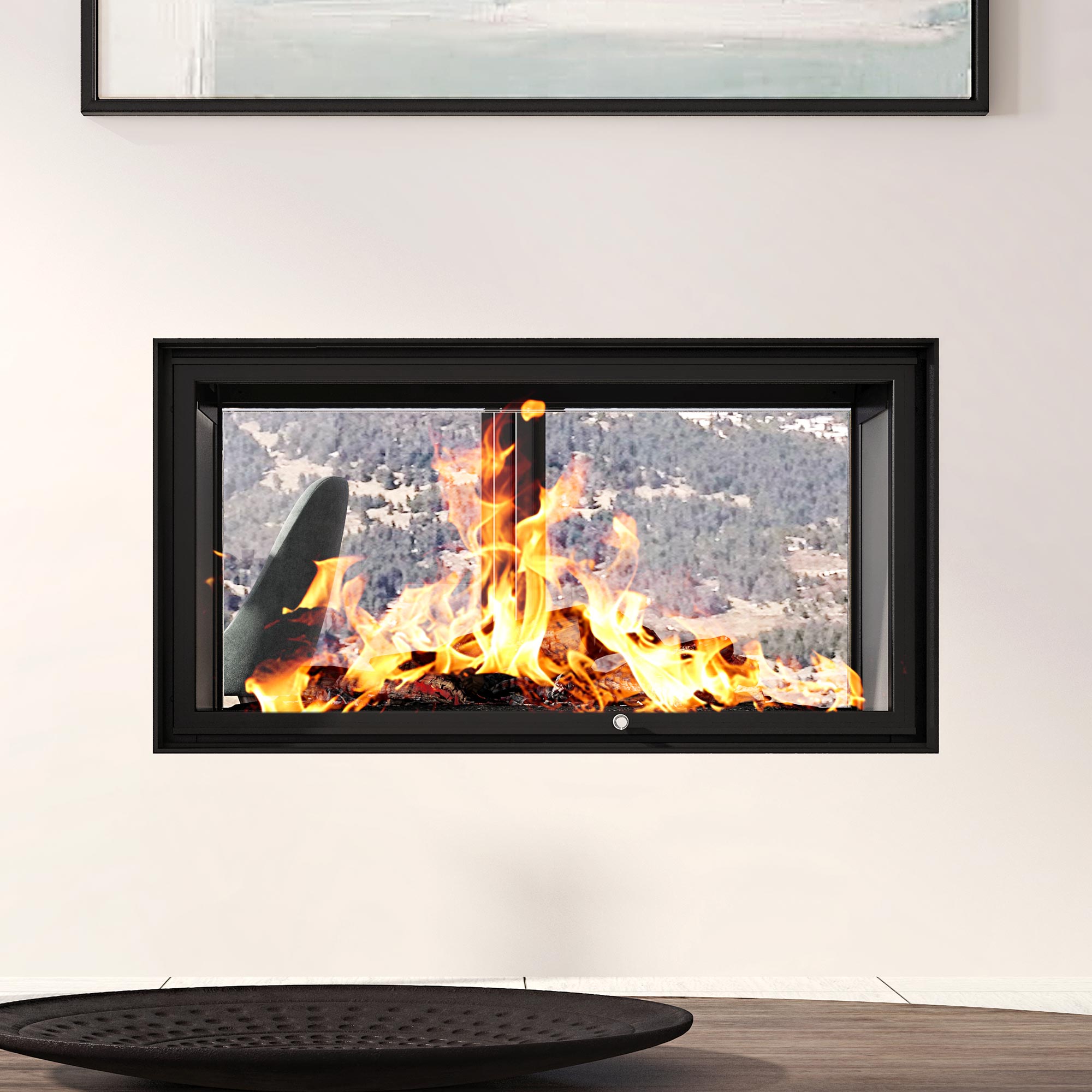 The LUXUS® 40 See-Thru Guillotine Wood Fireplace is going to transform your home and sooth the souls of all who are living there.  Enjoy the flames from two rooms simultaneously thanks to this “see-through” configurated wood fireplace that presents the fascination of fire on two opposite sides.  A large piece guillotine glass door in the front, and a large glass at the back.  With its BTU output of up to 49,000 BTU, this luxurious decorative fireplace will warm up and charm everyone in both rooms it faces.